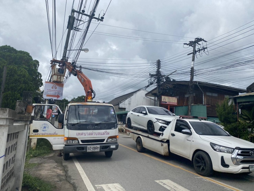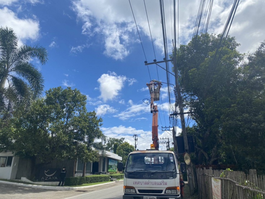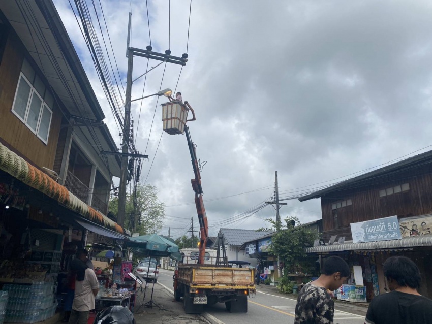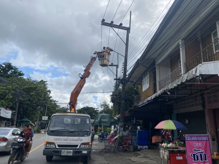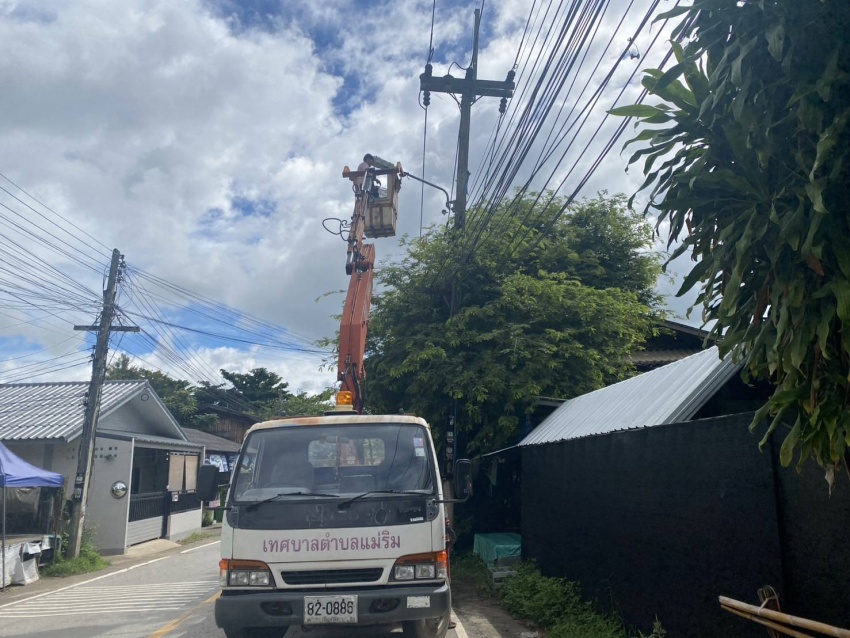 เจ้าหน้าที่กองช่าง เทศบาลตำบลแม่ริม ออกตรวจสอบดำเนินการซ่อมแซมไฟกิ่งถนน บริเวณชุมชนในเขตเทศบาล ในวันที่ 23 กันยายน 2568