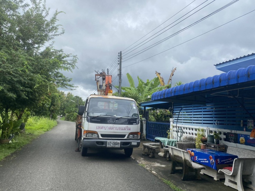 เจ้าหน้าที่กองช่าง เทศบาลตำบลแม่ริม ออกตรวจสอบดำเนินการซ่อมแซมไฟกิ่งถนน บริเวณชุมชนในเขตเทศบาล ในวันที่ 1 ตุลาคม 2568
