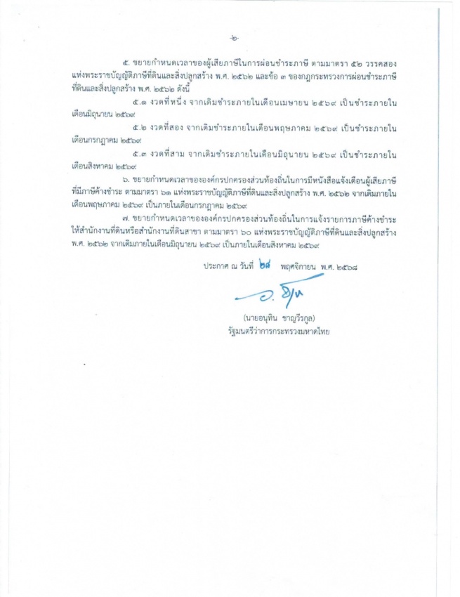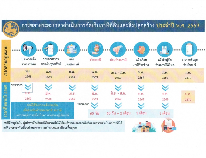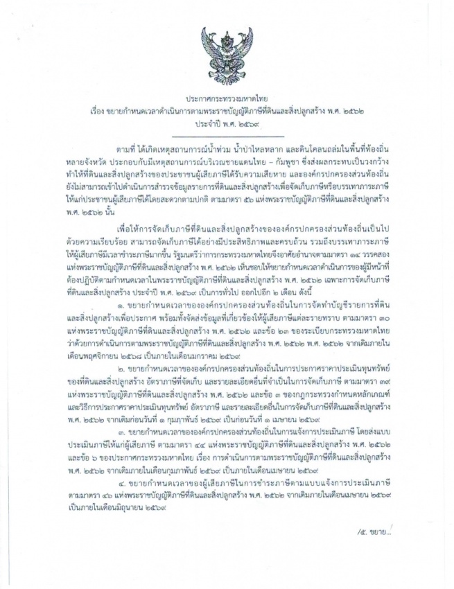 ประชาสัมพันธ์ ประกาศกระทรวงมหาดไทย เรื่อง ขยายกำหนดเวลาดำเนินการตามพระราชบัญญัติภาษีที่ดินและสิ่งปลูกสร้าง พ.ศ. 2562 ประจำปี พ.ศ. 2569