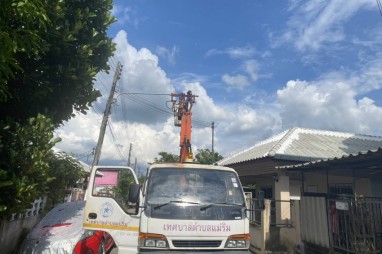 เจ้าหน้าที่กองช่าง เทศบาลตำบลแม่ริม ออกตรวจสอบดำเนินการซ่อมแซมไฟกิ่งถนน บริเวณชุมชนในเขตเทศบาล ในวันที่ 10 ตุลาคม 2568