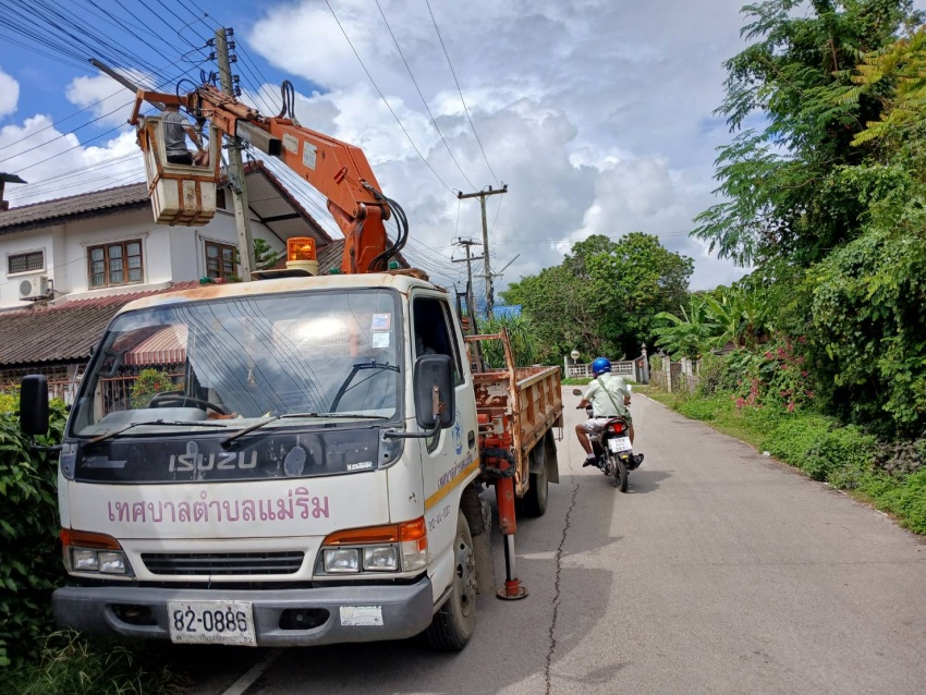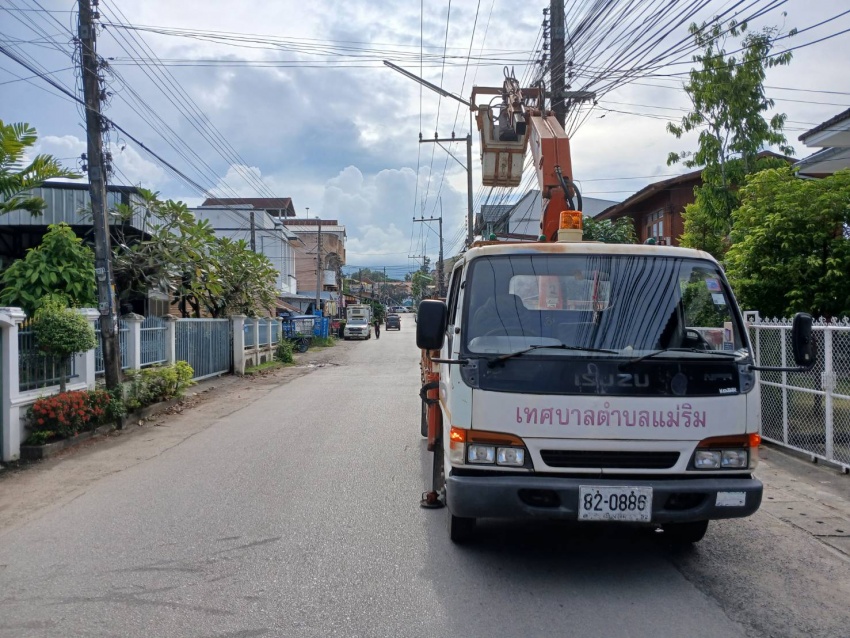 เจ้าหน้าที่กองช่าง เทศบาลตำบลแม่ริม ออกตรวจสอบดำเนินการซ่อมแซมไฟกิ่งถนน บริเวณชุมชนในเขตเทศบาล ในวันที่ 20 ตุลาคม 2568