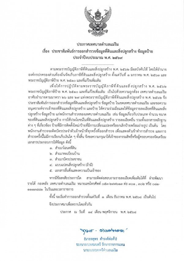 ประชาสัมพันธ์ ประกาศเทศบาลตำบลแม่ริม เรื่อง ประชาสัมพันธ์การออกสำรวจข้อมูลที่ดินและสิ่งปลูกสร้าง ข้อมูลป้าย ประจำปีงบประมาณ พ.ศ. 2569