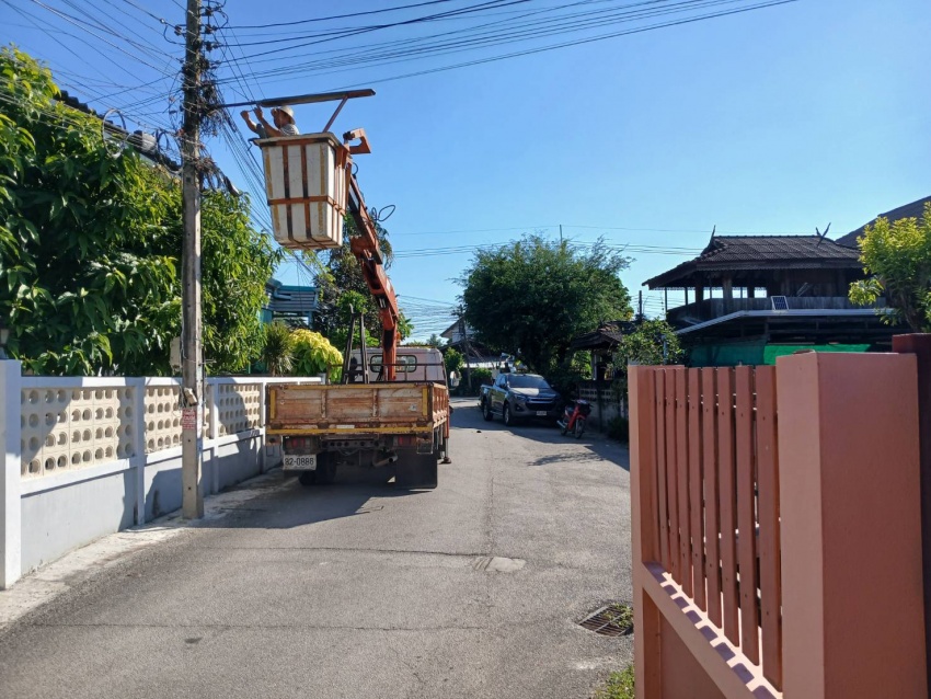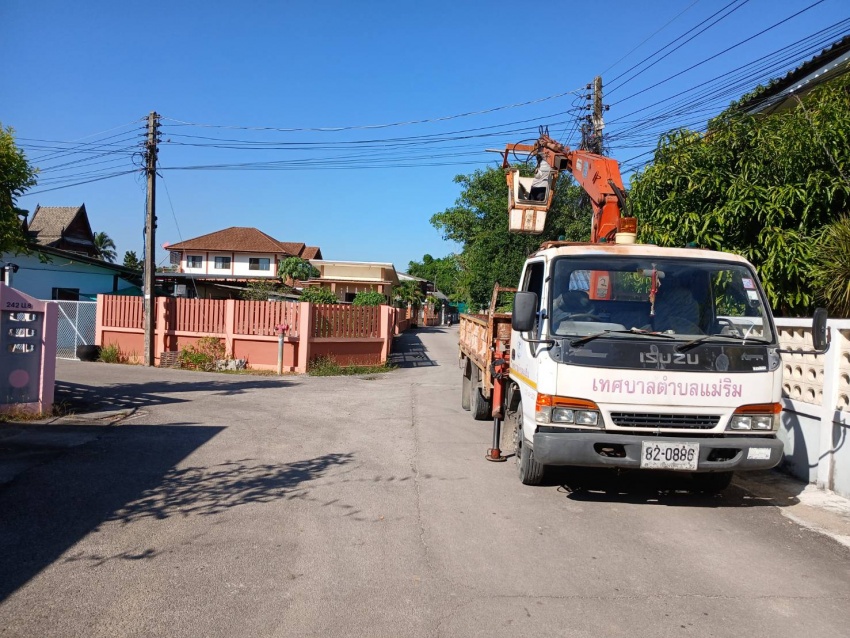 เจ้าหน้าที่กองช่าง เทศบาลตำบลแม่ริม ออกตรวจสอบดำเนินการซ่อมแซมไฟกิ่งถนน บริเวณชุมชนในเขตเทศบาล ในวันที่ 2 ธันวาคม 2568